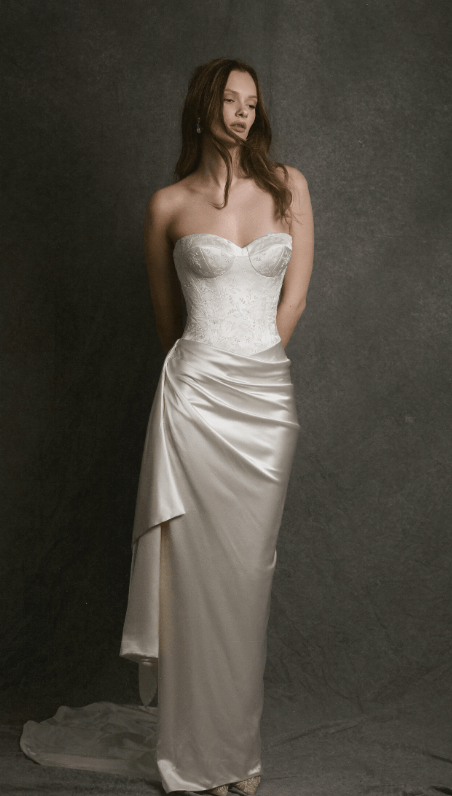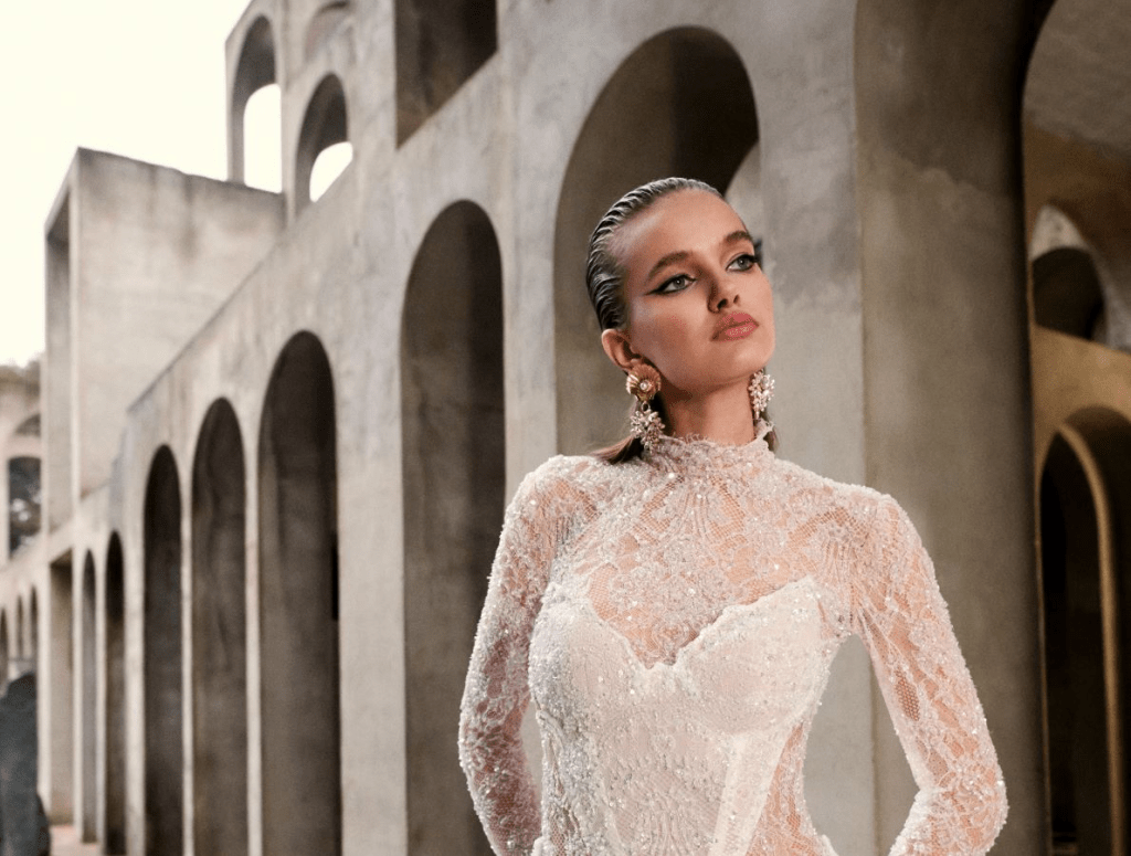 مستوحاة من منصات عرض دار ليهي هود في أسبوع الموضة للأعراس في نيويورك لربيع وصيف 2026، مع مكياج ناعم يكمل الإطلالة.
