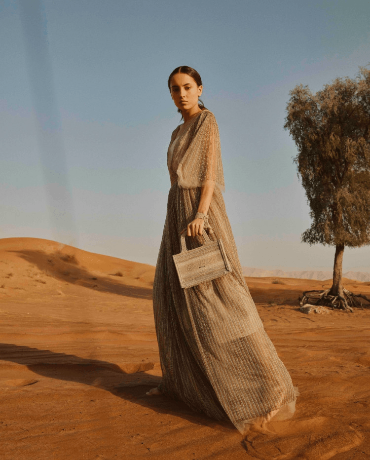 لتكمل هذه الإطلالة الرائعة، جرى تنسيق حقيبة ديور المصنوعة بخيوط معدنية تليق مع التصميم الفاخر، لتكون اللمسة المثالية التي تضيف المزيد من التألق و الفخامة.