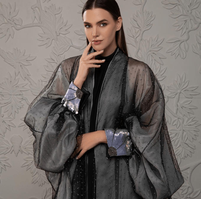 استلهمت ماركة ديباج كولكشن (Debaj Collection) في قطر إطلالة مميزة تبرز هذه الصيحة، حيث قدمت عباية رمادية شفافة ذات أكمام ضخمة، مما يضفي الفخامة على التصميم.