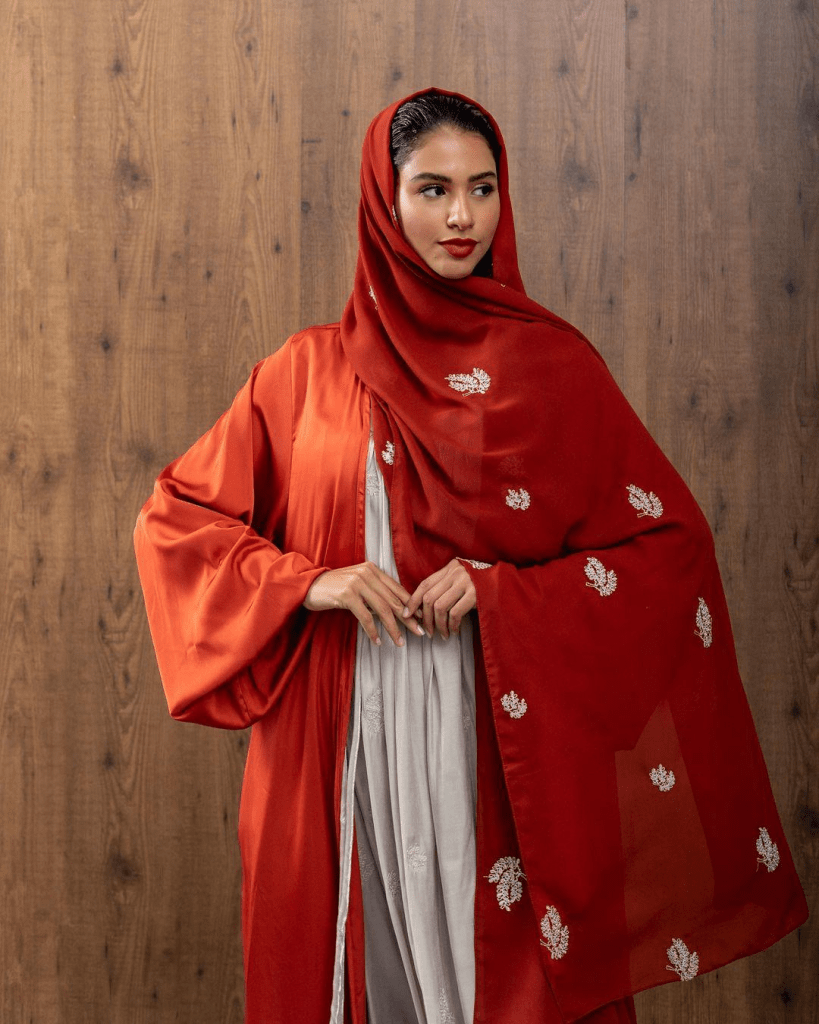وقد قدمت العلامة مؤخرًا عباءة حمراء تميل إلى اللون البرتقالي، مما يضفي لمسة دافئة وجذابة على الإطلالة.