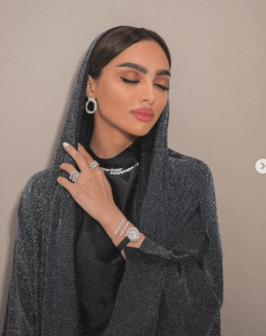 تميزت العباية بتفاصيلها الفضية التي أضافت لمسة من التألق والرقي، وقد أكملت جوري إطلالتها بلمسات من المجوهرات الفاخرة التي عززت من فخامة المظهر، مما يجعل الإطلالة متكاملة ومناسبة للمناسبات الراقية.