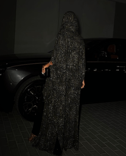 واحدة من اختياراتها المميزة كانت عباية سوداء براقة تتميز بالقصة الواسعة التي تضفي لمسة من الفخامة على التصميم.