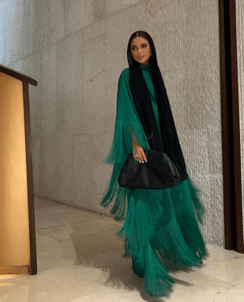 قدمت فاطمة حسام أيضًا عباية خضراء فاخرة مزينة بـ الشراشيب، والتي تعد من أبرز صيحات الموضة لهذا العام.