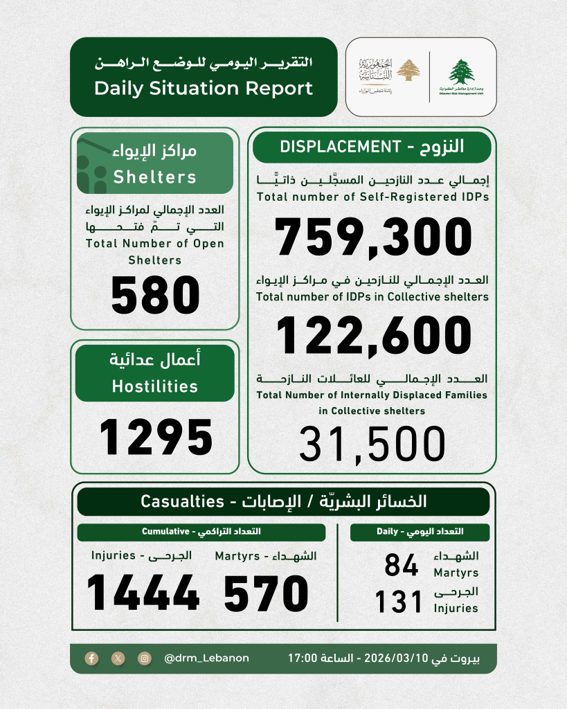 فيما بلغ عدد الضحايا في لبنان 570 قتيل و1444 مصابًا منذ بداية الحرب في 10 فبراير نتيجة الضربات الإسرائيلية، وفق مجلس الوزراء.