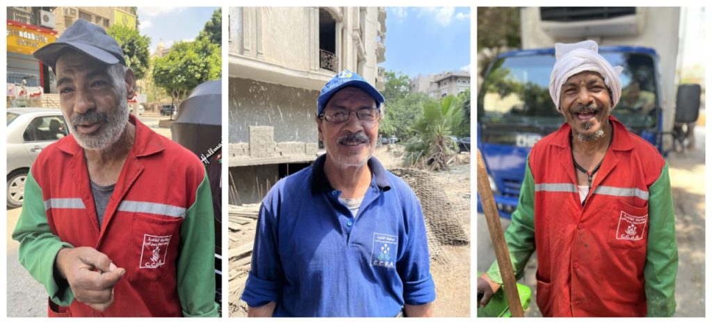 قابلنا الست عايدة السيد وقالت “هما ياستي بنييجي نكنس نلاقي الزبالة مرمية في الجناين وكل ما ننضف بيرموا تاني، بنبقى واخدين الشارع من أوله لأخره وطالع عينينا وهما يروحوا يرموها تاني.” ولما سألناها بالنسبة للناس اللي بترمي من العربيات، قالت “لأ مش بنشوفهم ولو شوفناهم هنزعق لهم.”