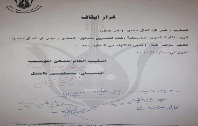 “قررت نقابة المهن الموسيقية وقف التصريح السنوي للعضو عمر محمد كمال، لحين التحقيق معه” ده كل اللي اتقال في التصريح والنقابة ماوضحتش سبب الإيقاف لحد دلوقتي وليه هيتم التحقيق.
