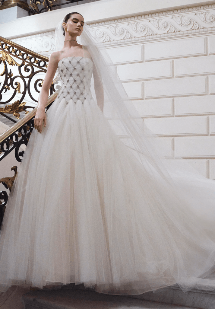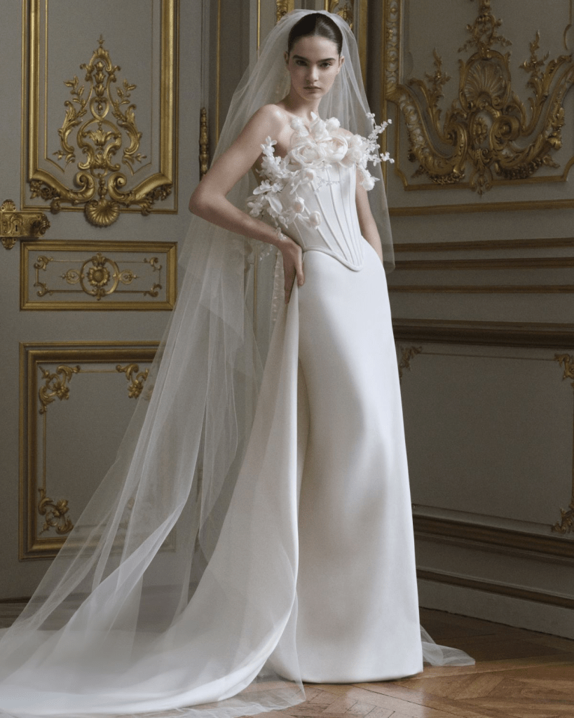بالإضافة إلى ذلك نرى عودة قوية لأزهار العاج الرقيقة التي تتفتح من الكورسيهات المهيكلة مما يضفي لمسة طبيعية.