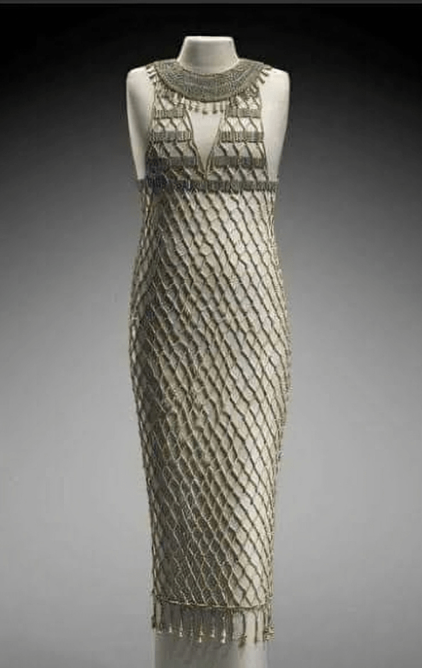 لم يكن مجرد فستان، بل تجسيد لفخامة الحضارة المصرية العريقة، حيث تميز بتطريز فاخر حول الرقبة والصدر، مستوحى من طوق الذهب الفرعوني.