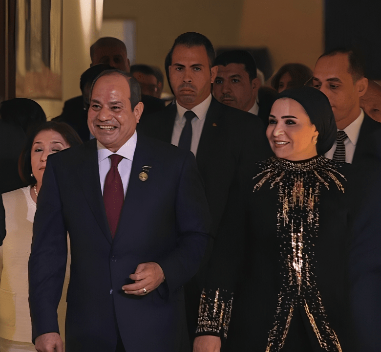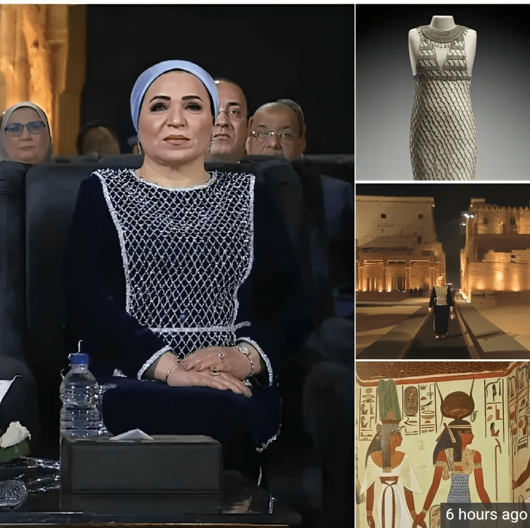 في حفل افتتاح المتحف المصري الكبير، برز فستان السيدة انتصار السيسي، وكان أسود طويل مطرز بخيوط ذهبية لامعة.