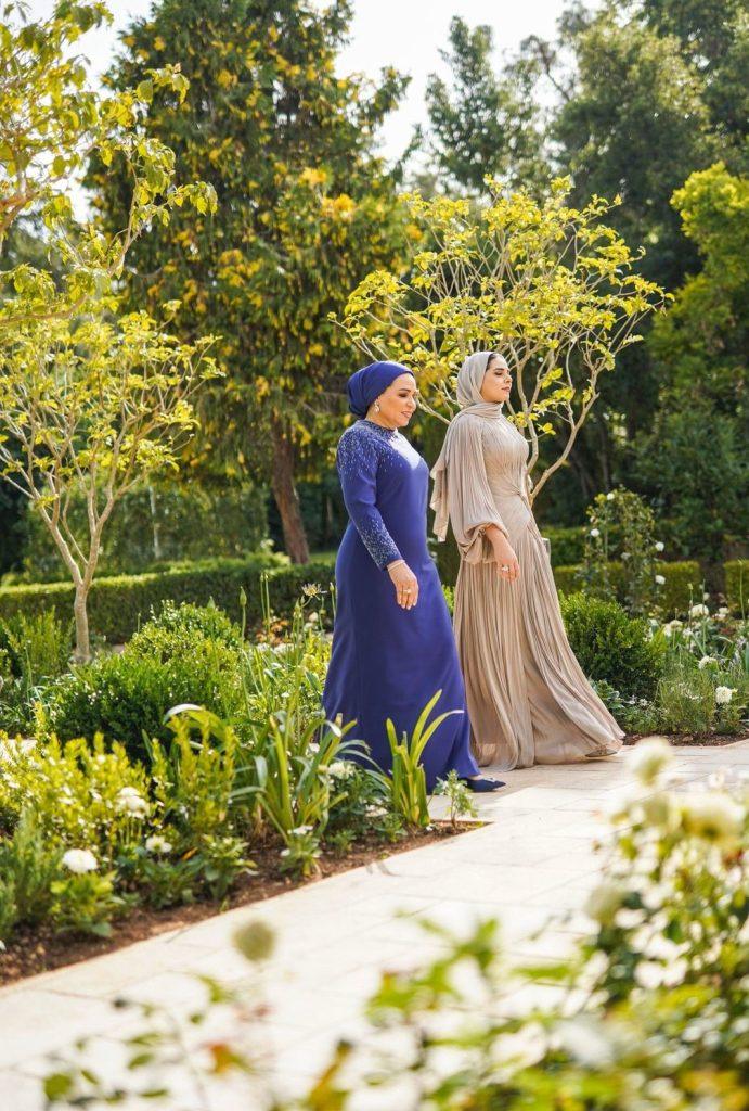 في حفل زفاف ولي العهد الأردني، تألقت السيدة انتصار السيسي بفستان أزرق مزخرف عند الكتف من تصميم مرمر حليم أيضًا.