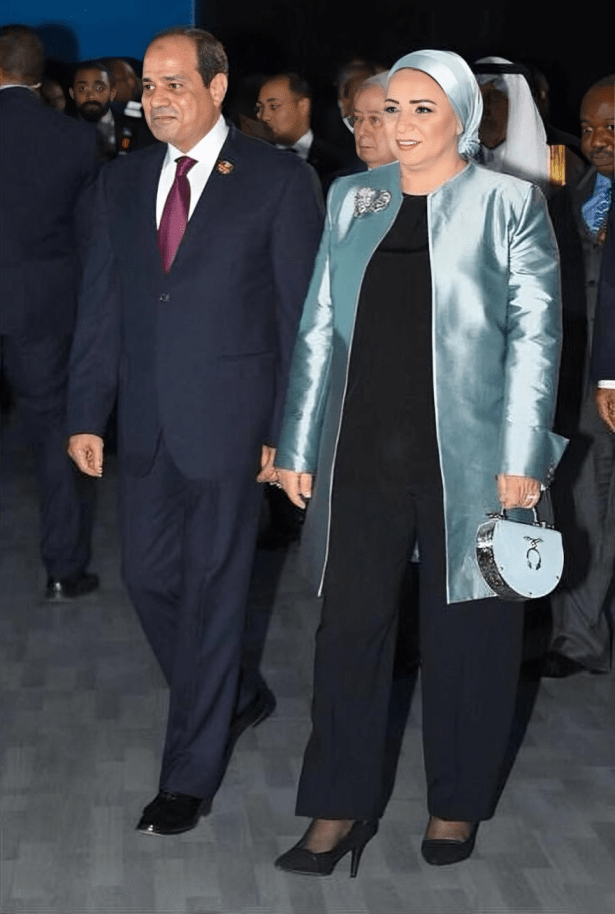 بالإضافة إلى ذلك، وفي حفل تنصيب الرئيس السيسي لولاية رئاسية ثانية، ظهرت قرينته بأزياء مصرية 100%، تعكس فخرها بالصناعة المحلية.