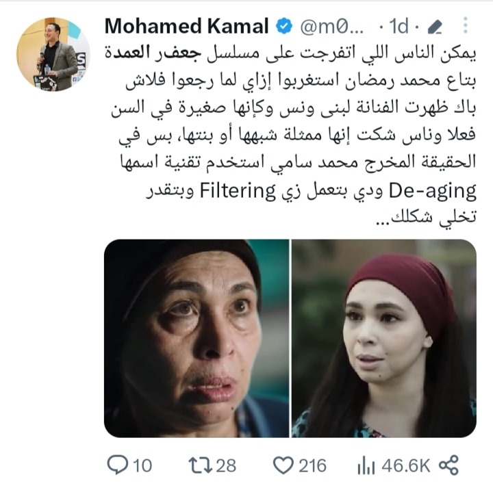 وبدأت الناس تعلق، وسابوا كل المشاكل اللي في المسلسل والناس اللي مقطعة بعض وزوجات جعفر العمدة اللي شبهوهم بزوجات الحاج متولي وبدؤوا يخمنوا ويسألوا: “هما بيصغروا وشوش الممثلين بسناب شات ولا فلتر؟ ولا ده بسبب الإضاءة والمكياج؟” وبدؤوا يدوا مقترحات لتطبيقات بتصغر الملامح زي (ري فيس – Reface) و(زيا) و(فيس أب – Faceapp).