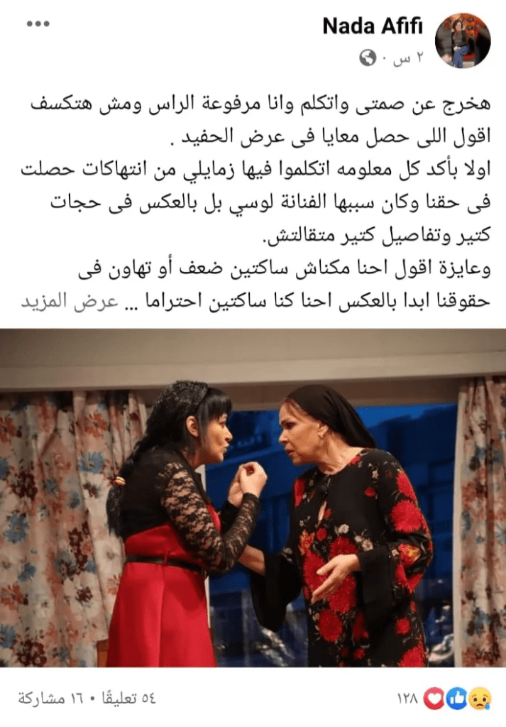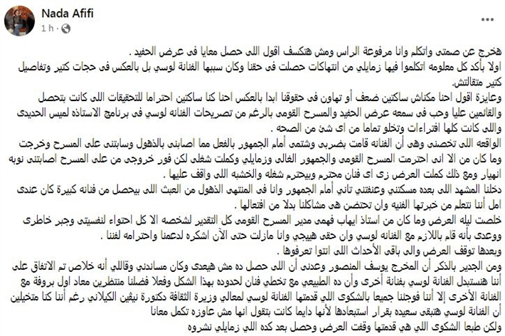 وكملت كلامها: “خلصت ليلة العرض وما كان من أستاذ إيهاب فهمي مدير المسرح القومي إلا كل احتواء لنفسيتي ووعدني بإنه سيتخذ اللازم مع الفنانة لوسي.. كنا هنكمل العرض لكن فاجئتنا إنها لم تحضر ولم تهتم ببروفة حددها المخرج وبعدها فوجئنا بإنها مقدمة شكوى فينا كلنا بلا استثناء لوزيرة الثقافة”.