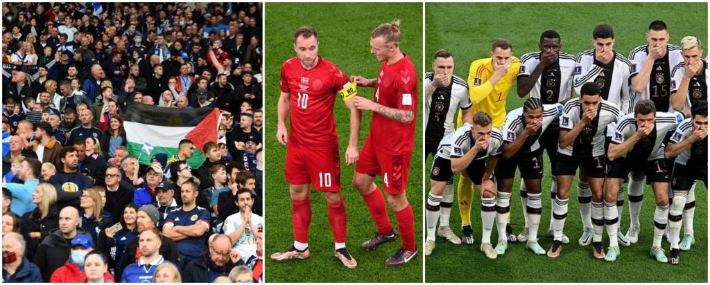 لكن بقوانين الفيفا، بشكل أو بآخر ماينفعش تدخل توجهات أو تعبر عن قضايا في أرض الملعب، أيًا كان التوجه أو القضية. ومؤخرًا، الدنمارك بتهدد بالانسحاب من بطولة كأس العالم بسبب رفض الفيفا رفعهم لشعار دعم المثلية ورفضهم ارتداء شارة القيادة بألوان وشعار المثلية. وشايفين إن دي عنصرية، كمان المنتخب الألماني في مباراته مع اليابان، عمل لقطة تكميم الأفواه في صورة ما قبل المباراة، اعتراضًا منهم على سياسة قمع الحريات -من وجهة نظرهم- اللي شايفين إنها مش بتخليهم محل احترام من الآخر وبتمنعهم من التعبير عن رأيهم.