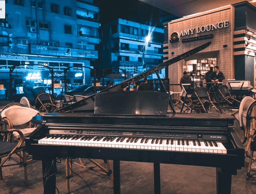 تحت كوبري الميرغني في مصر الجديدة، مشروبات وأكل ومخبوزات وكمان مزيكا بتتلعب قدامك لايف على البيانو.