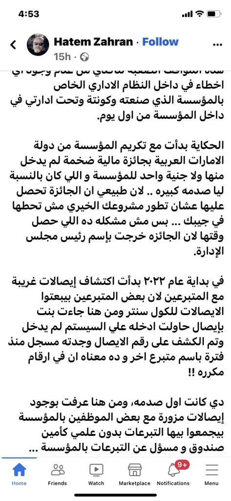 ذكر في البوست إن “الحكاية بدأت مع تكريم المؤسسة من دولة الإمارات العربية بجائزة مالية ضخمة لم يدخل منها ولا جنيه واحد للمؤسسة، واللي كان بالنسبة ليا صدمة كبيرة، لإن طبيعي إن الجائزة تحصل عليها عشان تطور مشروعك الخيري مش تحطها في جيبك”.