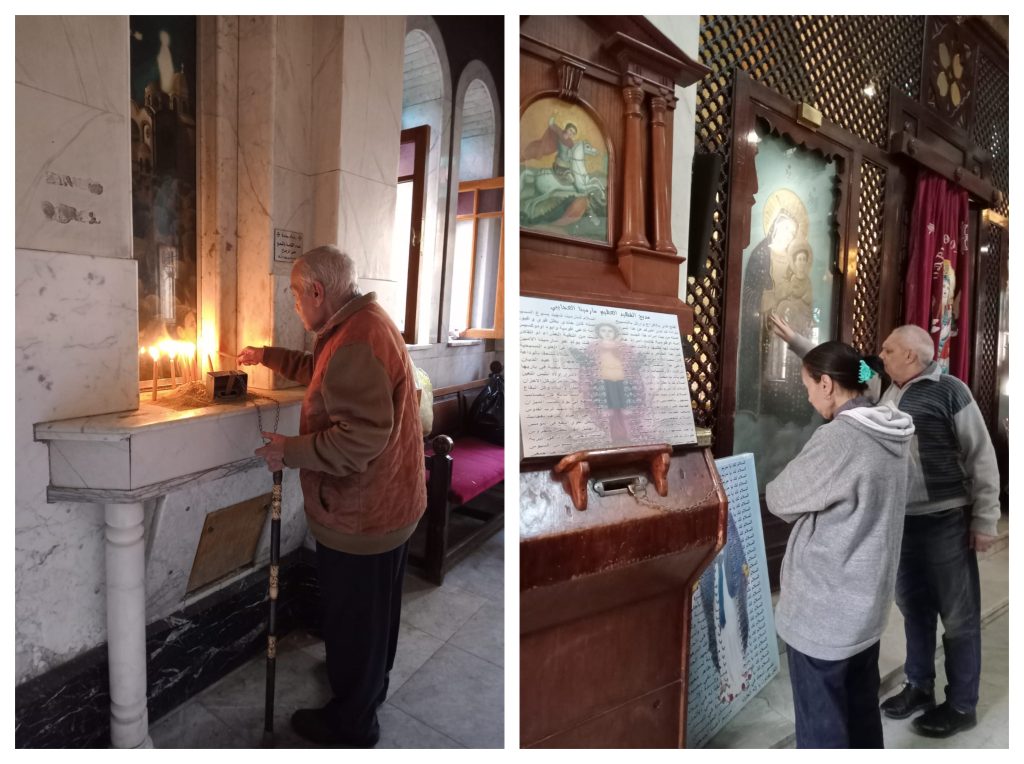 بعدها قررت أدخل الكنيسة وسط المصليين، وكانت أول مرة في حياتي أدخلها من جوا، كنت واقفة على الباب في الأول وأي حد داخل كان أول ما عينه تقع عليا يبتسم ابتسامة هادية ويدخل ياخد الشمعة ويصلي، وكان وسطهم بنت صغيرة بتعيط وهي ماسكة الشمعة في إيدها، ولما استنيت شوية لقيت مجموعة بدؤوا يقرؤوا تمجيد للعذراء ويتباركوا بصور وأيقونات لها في كل ركن في الكنيسة.