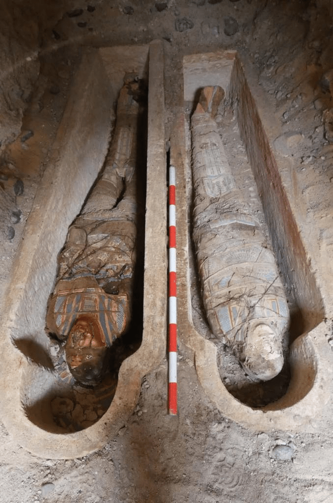 وتم العثور أيضًا على 4 توابيت مفتوحة و2 تابوت مغلق بداخلهما 2 مومياء لرجل وسيدة يعتقد أنهما زوج وزوجته وعليهما نقوش وأشار أن المومياوات حالة التحنيط بهما سيئة.