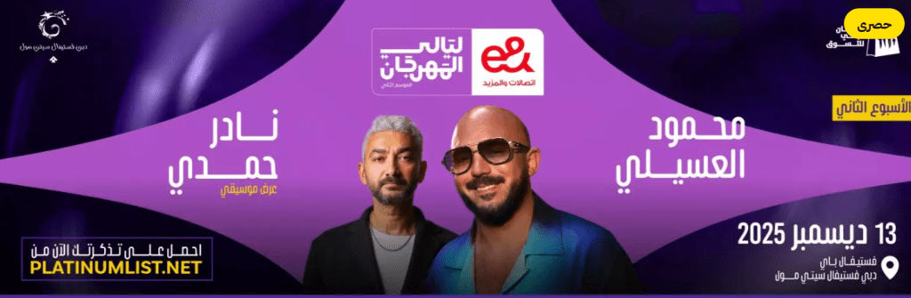 تقدّم ليالي المهرجان أمسية تفاعلية تضيف حيوية خاصة إلى فعاليات وحفلات ديسمبر في الإمارات بمشاركة العسيلي ونادر حمدي.
