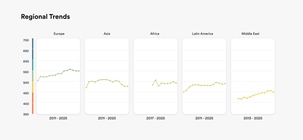 منذ 2011 وحتى 2020، شهدت آسيا صعودًا تدريجيًا في مستويات إتقان اللغة الإنجليزية، لكن تراجعًا ملحوظًا حدث بين 2021 و2025.