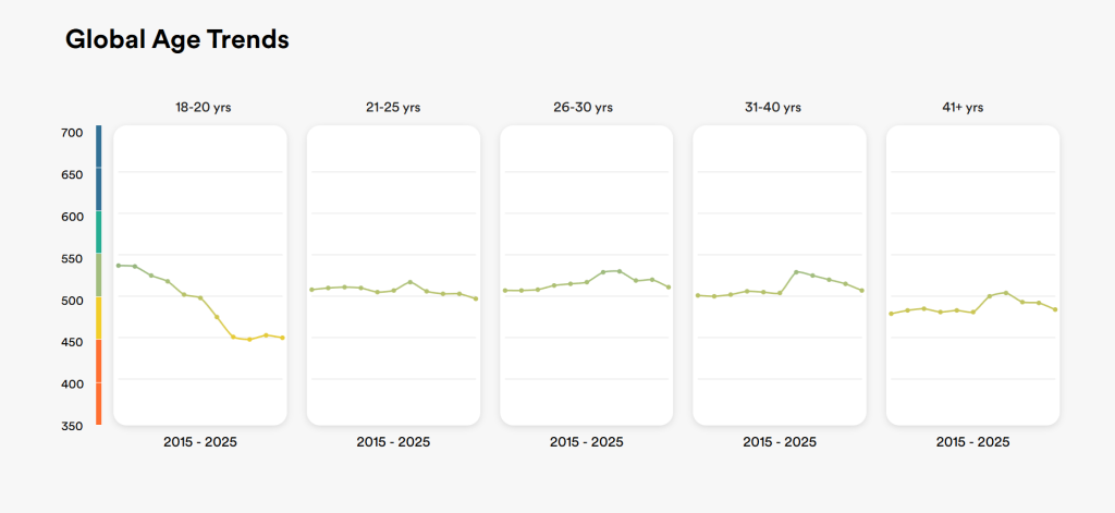 بداية من عام 2015، كانت الفئة العمرية (18-20 سنة) تمتلك أعلى مستويات الإتقان عالميًا، بتقارب 550 نقطة، لكن تراجعت تدريجيًا.