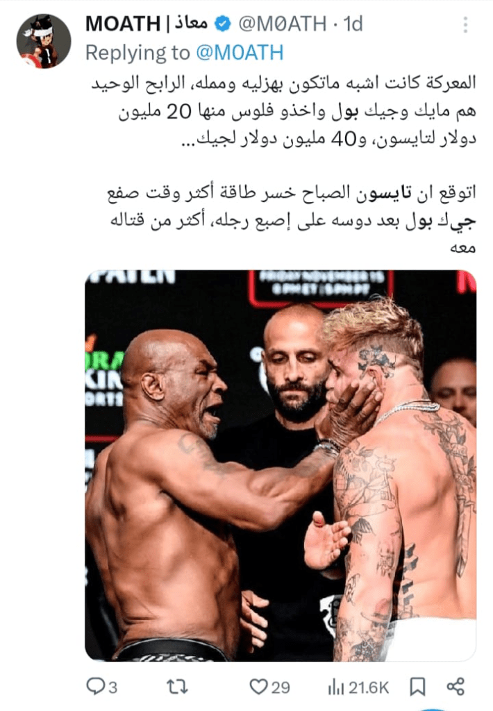 وعلق أحدهم قائلاً: “أعتقد أن تايسون فقد طاقة أكبر وهو يصفع جيك بول بعد أن داس على إصبع قدمه أكثر من طاقته في القتال”.