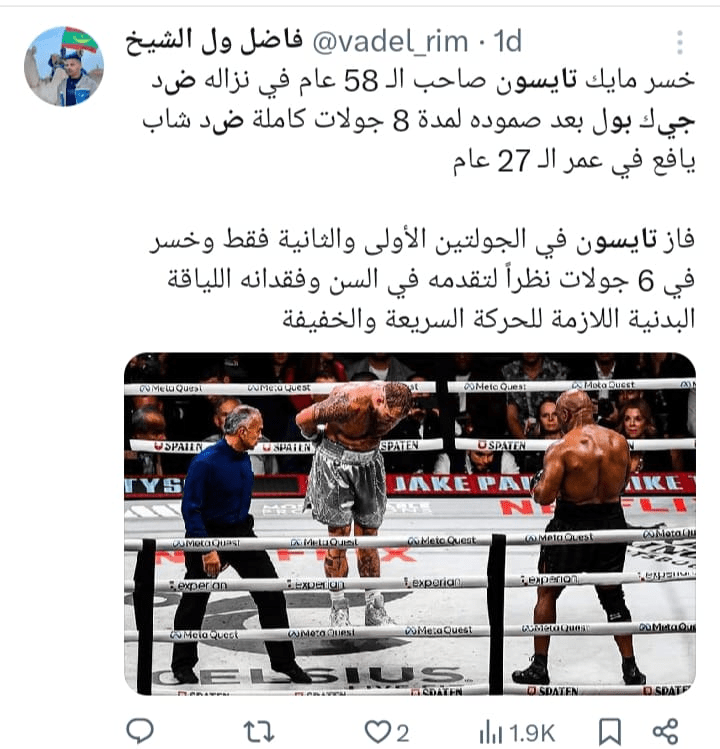 بينما حاول البعض تفسير خسارة تايسون، فقالوا: “تايسون خسر عشان عجوز وبيلاعب شاب عنده 27 سنة”.