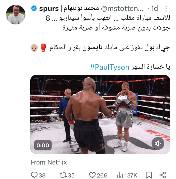 جاءت ردود فعل الجمهور العربي على المباراة مختلطة بين خيبة الأمل والاندهاش. أحدهم قال: “للأسف كانت مباراة مخيبة… انتهت بأسوأ سيناريو، 8 جولات دون ضربة مثيرة أو حماسية”.