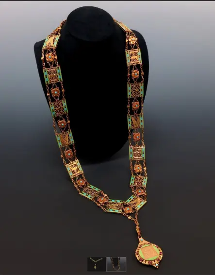 أما الحلية المتصلة بالقلادة، فتأتي بمشبك على شكل زهرتي لوتس، وتُزيَّن بزخارف فرعونية دقيقة وبألوان الميناء والفصوص الحمراء والزرقاء.