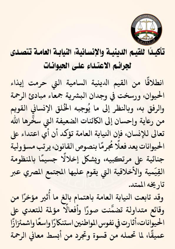وأكدت النيابة العامة أنها ستتعامل مع البلاغات بمنتهى الجدية، التزامًا بحماية حقوق الحيوان، وصون الضمير المجتمعي، ودعم قيم الرحمة والرفق.