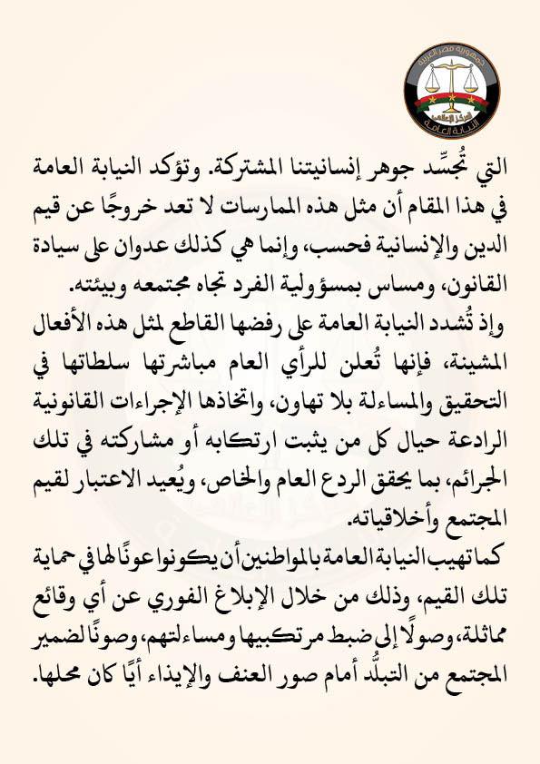 أكدت النيابة العامة في بيانها أنها لن تتسامح مع جرائم تعذيب الحيوانات، وستطبق إجراءات قانونية رادعة لتحقيق الردع العام والخاص.