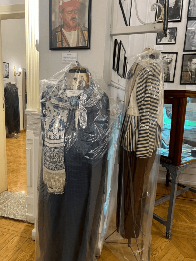 في مدخل المتحف ومن أول خطوة تطأ قدمك فيها المكان تتوه في بحر المقتنيات، على سبيل المثال ستجد طاقية وجلابية الفنان سيد زيان ومشيرة إسماعيل وفستانها الشهير في مسرحية الواد سيد الشغال، وعقيلة راتب صاحبة الدور الأشهر في فيلم “عائلة زيزي”.