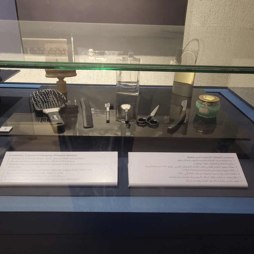 وبعد القاعتين ستطوف مع مجموعة آخرى من القاعات تحمل كل منها اسمًا وتحكي جزءًا من تاريخ الأديب؛ منها قاعة “أصداء السيرة” التي تحكي نشأته وحياته وعرفنا منها أن نجيب سمي على اسم رائد الطب نجيب باشا محفوظ الذي أنقذ حياة والدته وأن ساعات طقوس الكتابة عند نجيب كانت من الرابعة حتى السابعة وأن ميعاده المفضل في الاستيقاظ كان بعد الفجر والمكان المفضل للمشي هو كورنيش النيل، كما ضمت القاعة بعضًا من متعلقاته الشخصية، مثل أدوات الحلاقة، ونظارته وقلمه، وبدلته الرسمية المعروفة.