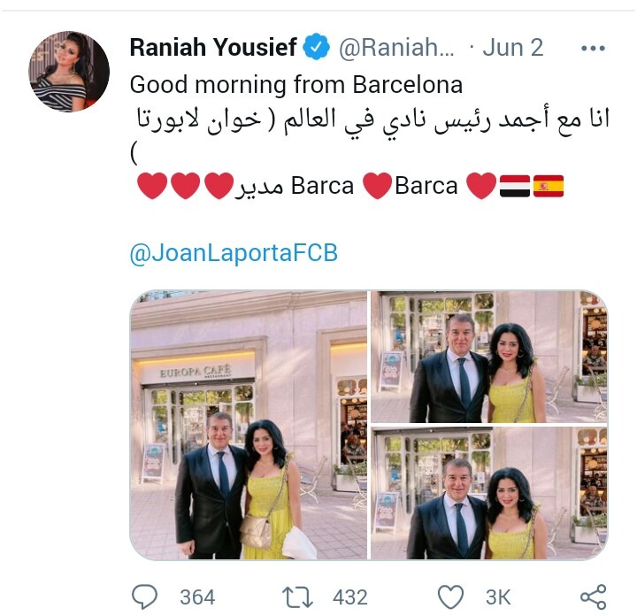 بعد ما نشرت رانيا يوسف صورة ليها مع رئيس نادي برشلونة الإسباني (خوان لابورتا)، اتعرضت بعدها مباشرة لهجوم عنيف في التعليقات على صفحتها على الفيس بوك وعلى تويتر وده طبعًا بسبب الصورة وكابشن اتكتب بحسن نية، لكن طبعًا مفيش حاجة بقى اسمها حسن نية في السوشيال ميديا، بقى كل حاجة بتنزل عليه ولو بسيطة، بقيت مادة للتافهين واللي عندهم انحراف أخلاقي واللي سمحوا لنفسهم يجرحوا غيرهم بدون أي وجه حق ومعتبرينه حق مكتسب.