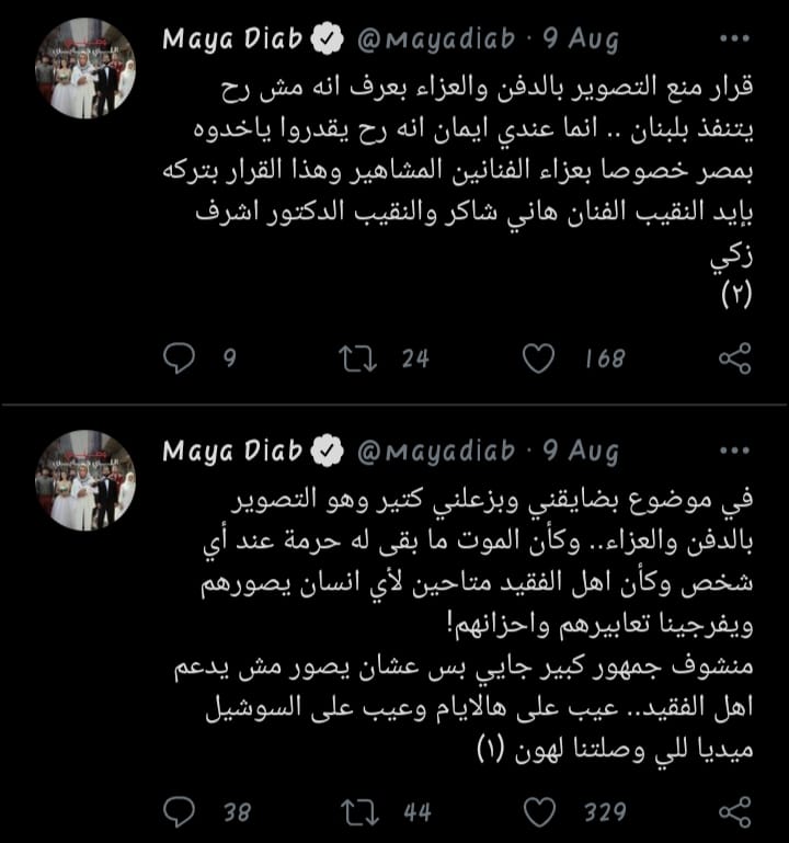 الموضوع اتحول من مجرد توثيق للحدث لنوع من أنواع اقتحام الخصوصية أحيانًا، وده يمكن اللي خلى فنانين يتكلموا في الموضوع ده وخصوصًا بعد وفاة الفنانة دلال عبد العزيز، وكان من ضمن الفنانين مايا دياب اللي عبرت عن غضبها الشديد من فكرة التصوير في العزاء والدفنة، وقالت إنه لازم يبقى في قرار يمنع الموضوع ده بشكل نهائي، لإن مش من حق حد أبدًا إنه يصور أهل المتوفي وهو في لحظات ضعفة وحزنه، لإنها لحظات خاصة جدًا، وماينفعش اللحظات دي تبقى وسيلة أو مادة إعلامية بأي شكل من الأشكال.