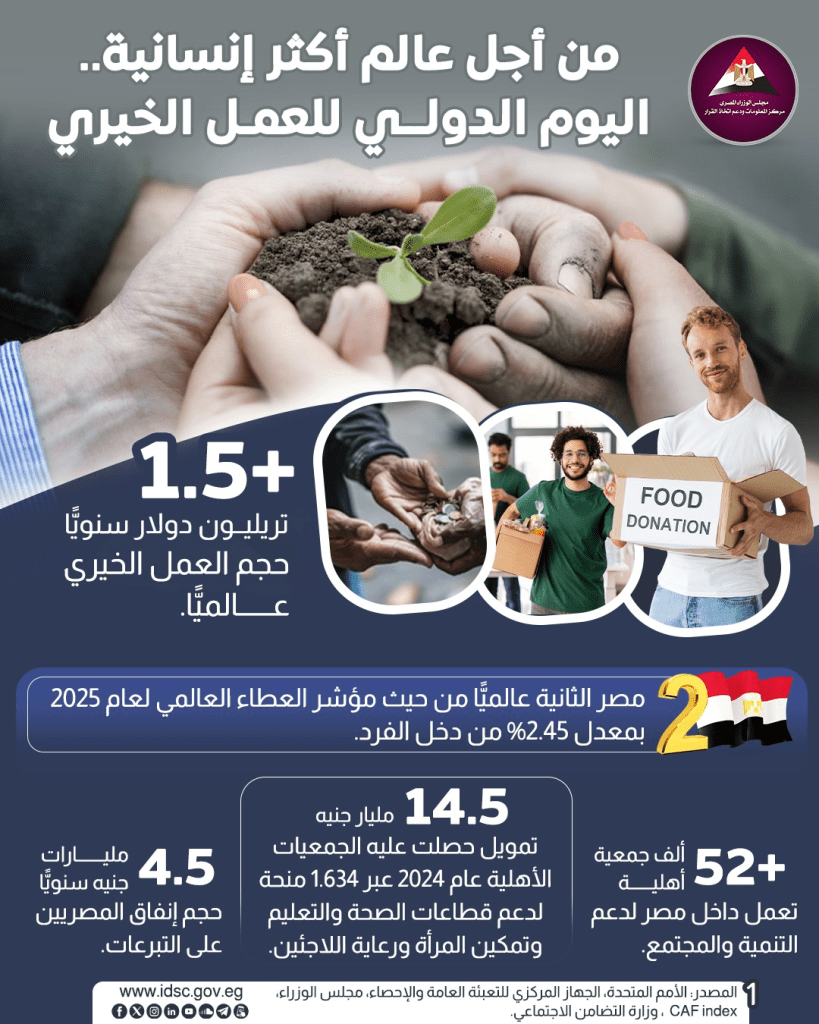 ويذكر أن حجم العمل الخيري عالميًا يتجاوز 1.5 تريليون دولار سنويًا، بينما تحتضن مصر أكثر من 52 ألف جمعية أهلية تعمل في التنمية والمجتمع.