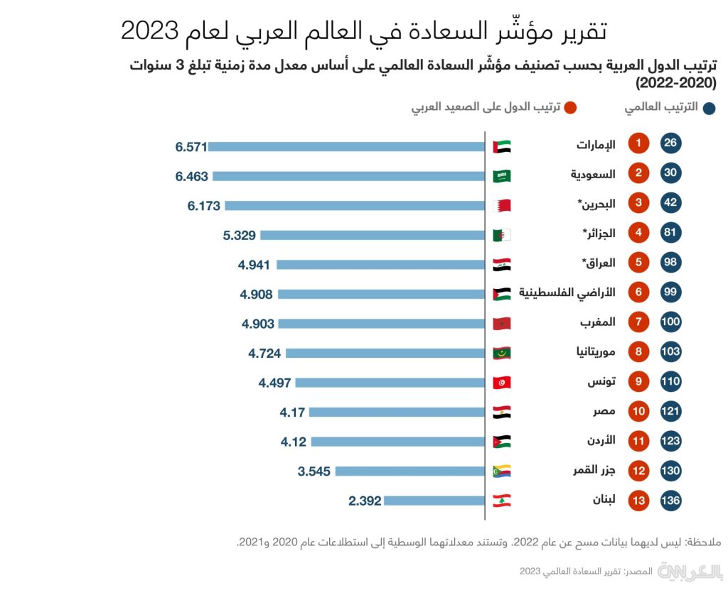 فنلندا احتلت المركز الأول كأسعد بلد في العالم، بعدها الدنمارك في المركز التاني، وأيسلندا في المركز التالت، وفي العالم العربي احتلت الإمارات المركز الأول عربيًا والـ 26 عالميًا، بعدها السعودية في المركز التاني عربيًا والـ 30 عالميًا، وترتيب مصر كان في المركز الـ 10 عربيًا والـ 121 عالميًا، ولبنان وأفغانستان احتلوا آخر القائمة.