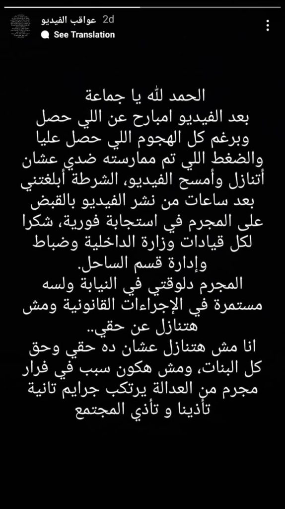 المتحرش وأبوه عارفين إنها ساكنة في شارعهم، وده مامنعهمش من التعدي عليها، لأ وكمان الناس بتقول لها هي تسكت وكفاية كده عيب! بدل ما يقفوا معاها ضد أشخاص ماعندهمش أي إنسانية ولا نخوة، بينضموا لهم كمان في الجريمة! ليللي صوتها كان واضح في الفيديو وهي بتقول “مش معقول أنزل الشارع كل يوم حد يتحرش بيا” و”شكراً يا رجالة مصر يا اللي شاهدين على التحرش”.