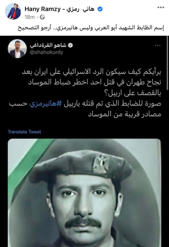 الموضوع بدأ بتويت بعد ما اتعرضت أربيل في 13 مارس لقصف بـ 12 صاروخ، وبعد ساعات أعلن الحرس الثوري في إيران مسئوليته عن القصف، وقال إنه استهدف مركز للموساد، وقتل ظابط من الموساد اسمه هاني رمزي! وبعدها علق الكاتب والباحث السياسي العراقي “شاهو القرةداغي” على الخبر وسأل، في رأيكم الرد الإسرائيلي هيكون إيه على طهران بعد ما نجحت في إنها تقتل واحد من أخطر ظباط الموساد “هاني رمزي”، حسب مصادر قريبة من الموساد؟