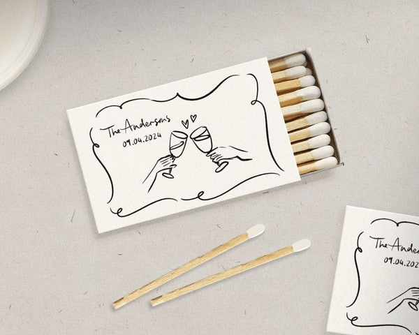 رغم بساطتها، تظل علب الكبريت من الهدايا الكلاسيكية التي يمكن تحويلها إلى ذكرى أنيقة. اطبعوا أسماءكما أو تاريخ الزفاف على العلبة أو أسماء المدعويين.