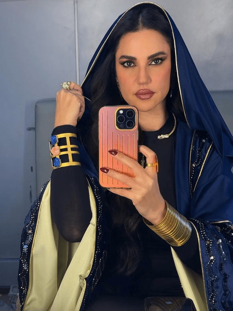 بدايةً، تظهر ميادة بعباءة سوداء فريدة تتداخل فيها الألوان الصفراء مع أكمام مطرزة بالترتر اللامع، لتخلق توازناً مذهلاً بين العصرية والتراث.
