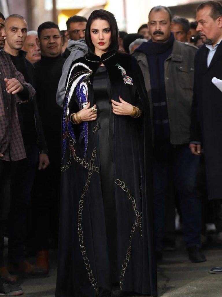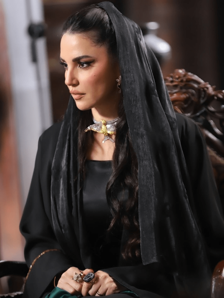 تألقت “ميادة” بعباءة سوداء فاخرة مزينة برسومات الطاووس الملونة، مما أضفى لمسة من الهيبة والجمال على حضورها القوي في المسلسل.
