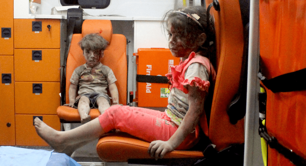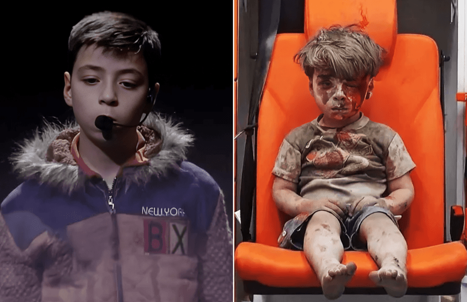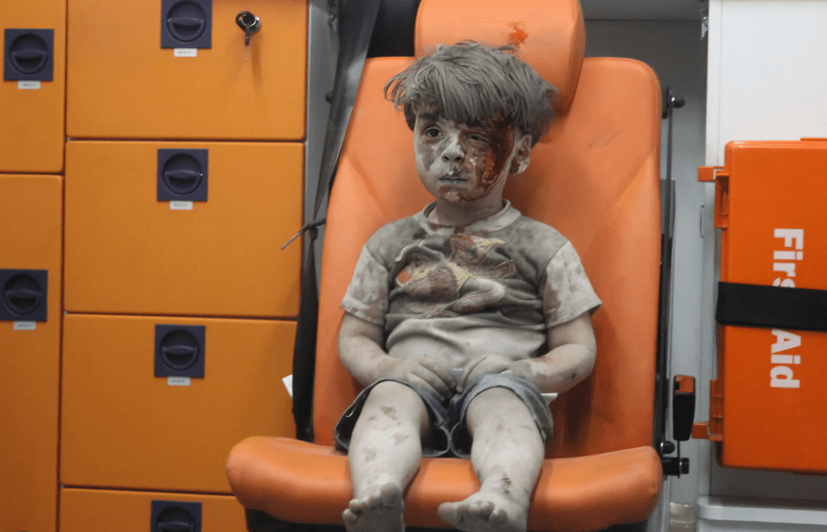كان عمران، ذو الأربعة أعوام وقتها، يجلس مذهولاً داخل سيارة إسعاف، مغطى بالغبار والدماء تسيل من وجهه الصغير.